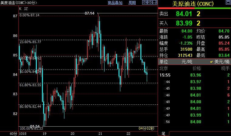 北京时间15:56,NYMEX原油期货下跌1.21%至84.02美元/桶;ICE布伦特原油期货下跌1.15%至90.29美元/桶。