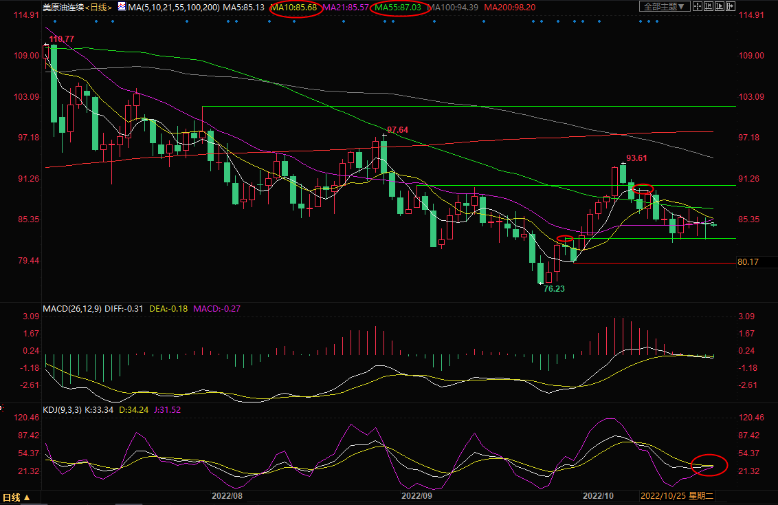 周二(10月25日)亚欧时段,美原油窄幅震荡,目前交投于84.77美元/桶附近,本周OPEC+消息相对较少,市场观望情绪较浓,一方面,周一欧美国家10月份的PMI数据表现较差,增加了市场对全球经济衰退和原油需求前景的担忧,但另一方面,市场对美联储12月份加息75个基点的预期减弱,欧美股市普遍上涨,又给油价提供支撑。技术面来看,油价连续一周窄幅震荡,短线走势缺乏明确方向。