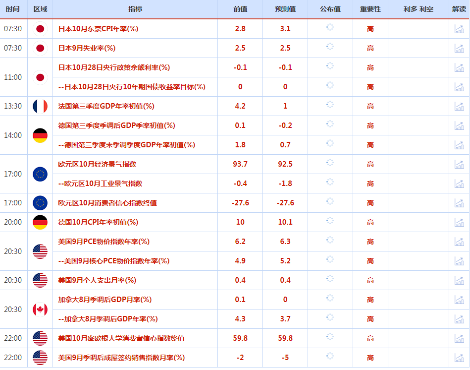 北京时间周五(10月28日)亚市早盘,美元指数交投于110.56附近;美元周四走强,美国第三季国内生产总值(GDP)结束了连续两个季度产出下降的趋势,这曾引发人们对经济陷入衰退的担忧;欧元下跌超过1%,兑美元回到平价之下,欧洲央行将存款利率提高75个基点,至1.5%的2009年以来最高水平,以防止价格快速增长变得根深蒂固;金价下跌,美元上涨盖过了美联储在下周政策会议后将放缓加息的预期带来的支持;油价延续了前一天近3%的涨势,因为对美国原油出口创纪录的乐观情绪和经济衰退担忧减弱的迹象盖过了对需求疲软的担忧。