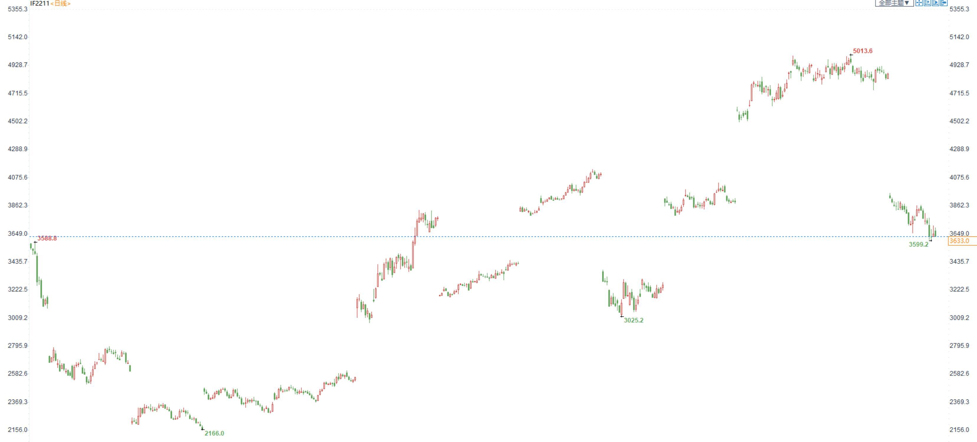 【今日行情】四大期指涨跌互现。IH2211收盘价为2379.8,收跌0.64%;IF2211收盘价为3633,收跌0.46%;IC2211收盘价为5971.2,收涨0.22%;IM2211收盘价为6473,收跌0.05%。今日市场开盘表现抗跌,上证综指开于3000点上方,随后市场分化,IF和IH高开低走,上证综指3000点再度得而复失,IC和IM表现较为抗跌,震荡为主,未有明显走弱。市场成交额增至9245.87亿元,连续第二个交易日突破9000亿元。