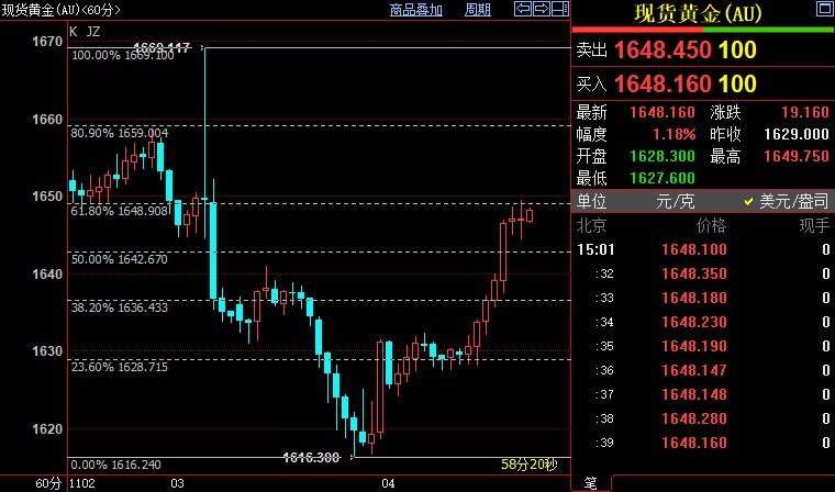 北京时间15:02,现货黄金上涨1.20%至1648.91美元/盎司;COMEX期金主力合约上涨1.26%至1651.4美元/盎司;美元指数下跌0.43%至112.501。
