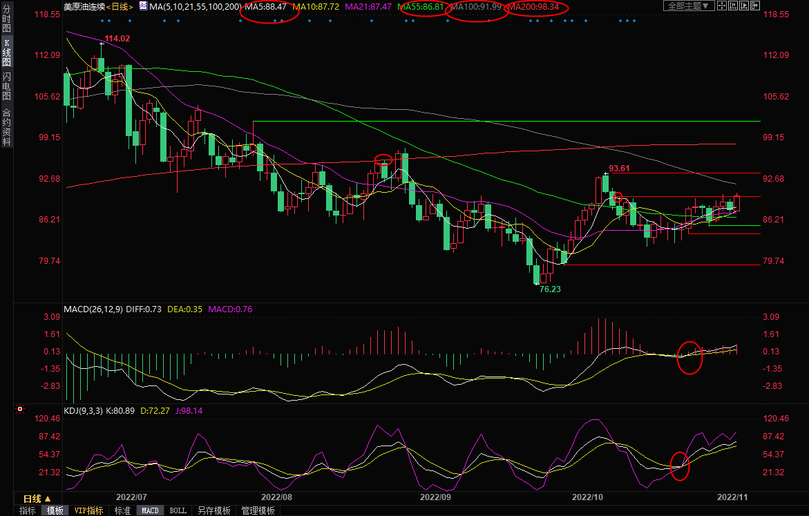 当然,目前仍需提防假突破的可能性;下方5日均线支撑在88.45附近,若回落至该位置下方,则削弱短线看涨信号;21日均线支撑在87.47附近,55日均线支撑在86.81附近。10月31日低点支撑在85.29附近;如果失守该支撑,则增加后市看空信号。