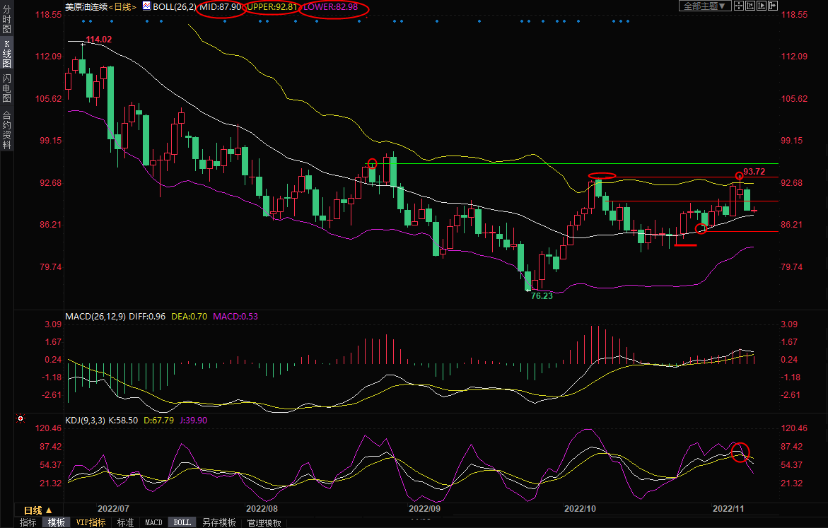 日线级别:震荡;油价周一在逾两个月高点附近受阻,收盘于布林线上轨下方,周二大幅走弱,连续失守100日均线91.46和90整数关口,K线在局部形成类似“黄昏之星”的顶部组合,KDJ相对高位重新结成死叉,油价短线看空信号显著增强,初步支撑在布林线中轨87.89附近,若回落至该位置下方,则油价可能会进一步跌向布林线下轨82.98附近;短线的话。55日均线86.66附近、10月31日低点85.29附近也还分别存在一些支撑。