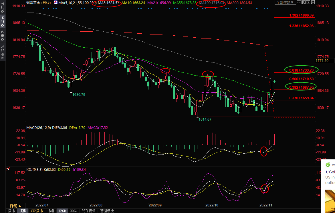 周三(11月9日)亚洲时段,现货黄金窄幅震荡,目前基于1708美元/盎司附近,本交易日无重要经济数据出炉,市场观望情绪较浓,等待周四将出炉的美国10月份CPI数据,尽管隔夜金价大涨,但市场预计美国CPI数据可能会对美联储放缓加息步伐的预期产生冲击,再加上技术面100日均线和布林线上轨的压制,短线金价面临一定的调整需求,但预计在失守1687.90前,后市仍偏向多头。