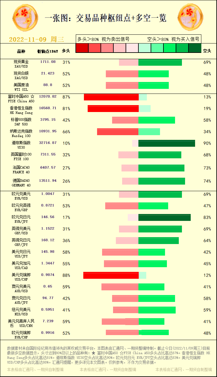 一张图:交易品种枢纽点+多空占比一览。截止今日(2022/11/09周三)目前最新多空数据显示,头寸达到80%及以上的品种有:★ 富时中国A50 ☆FTSE China A50多头占比高达87%。香港恒生指数 HK Hang Seng多头占比高达81%。道琼斯指数 US30空头占比高达90%。欧元兑日元 EUR/JPY空头占比高达83%。美元兑瑞郎 USD/CHF多头占比高达88%。汇通网提醒,更多详见本文图表。仅供参考,不作为交易依据。