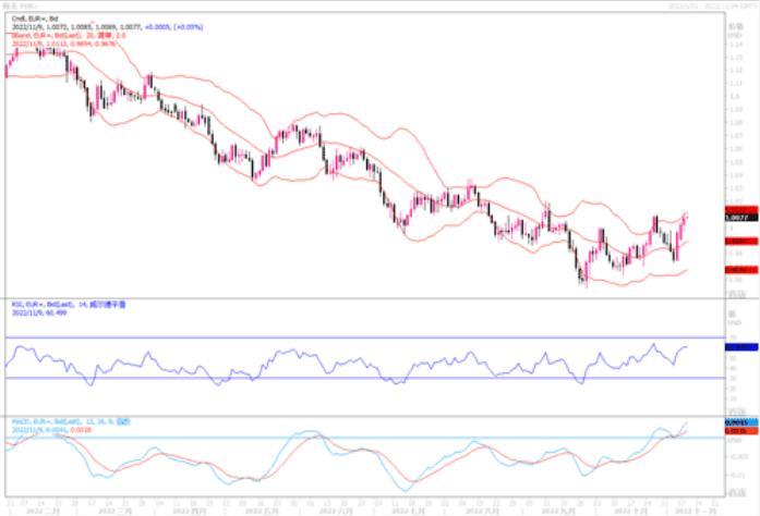 周二(11月8日)德国公债收益率攀升推动欧元走强。由于对欧洲央行进一步收紧政策的预期,德债收益率稳步攀升,削弱了美元,也令欧元区和美国公债收益率差收窄,两年期德债收益率升至2.196%,比一周前高了25个基点。而且周一公布的一项调查显示,欧元区11月投资者士气有所改善,这是三个月来首次上升,反映出投资者希望近期气温上升和能源价格下跌将避免今年冬天欧洲实行天然气配给。欧元兑美元上涨0.48%,至1.0067美元。日线图上,欧元兑美元再度攀升之两周前的高点1.0093附近,各类技术指标配合性的上扬;4小时图上,汇价穿越各短期均线上方,MACD红色动能柱向上发散,显示欧元多头开始活跃。日内留意1.0093-1.0100区域的阻力硬度,若再度遇阻,小心在图形上形成双顶形态。而如果能突破,上方目标将是8月份到过的高点1.0320-1.0360区域。