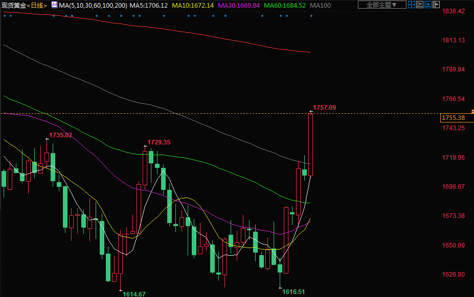 在美国数据公布后,美元大跌2%至近两个月低点,使黄金对其他货币持有者来说价格降低。指标美国10年期国债收益率降至一个月最低。