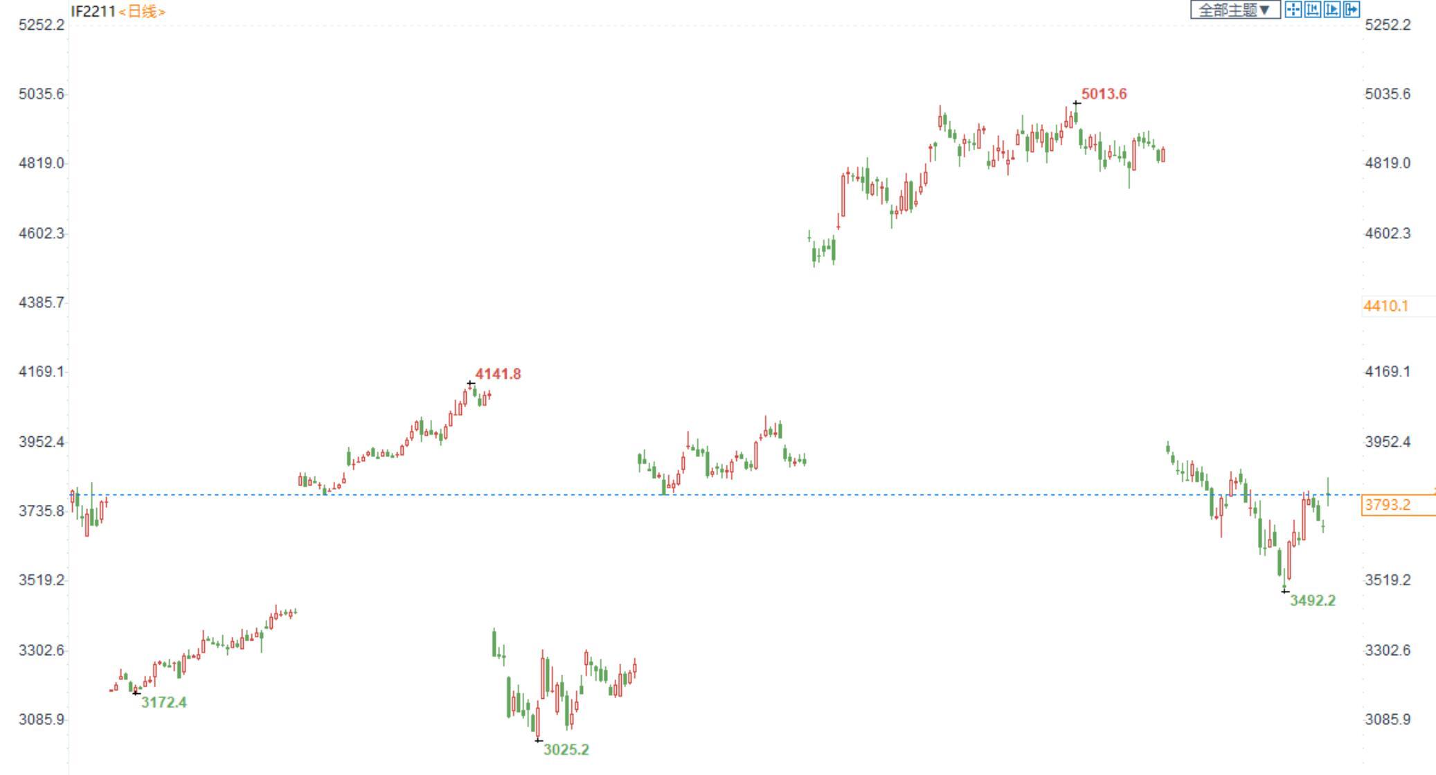【今日涨跌】四大期指全线收跌。IH2211收盘价为2438.2,收跌0.92%;IF2211收盘价为3712.2,收跌1.18%;IC2211收盘价为6123.2,收跌0.35%;IM2211收盘价为6674.8,收跌0.49%。