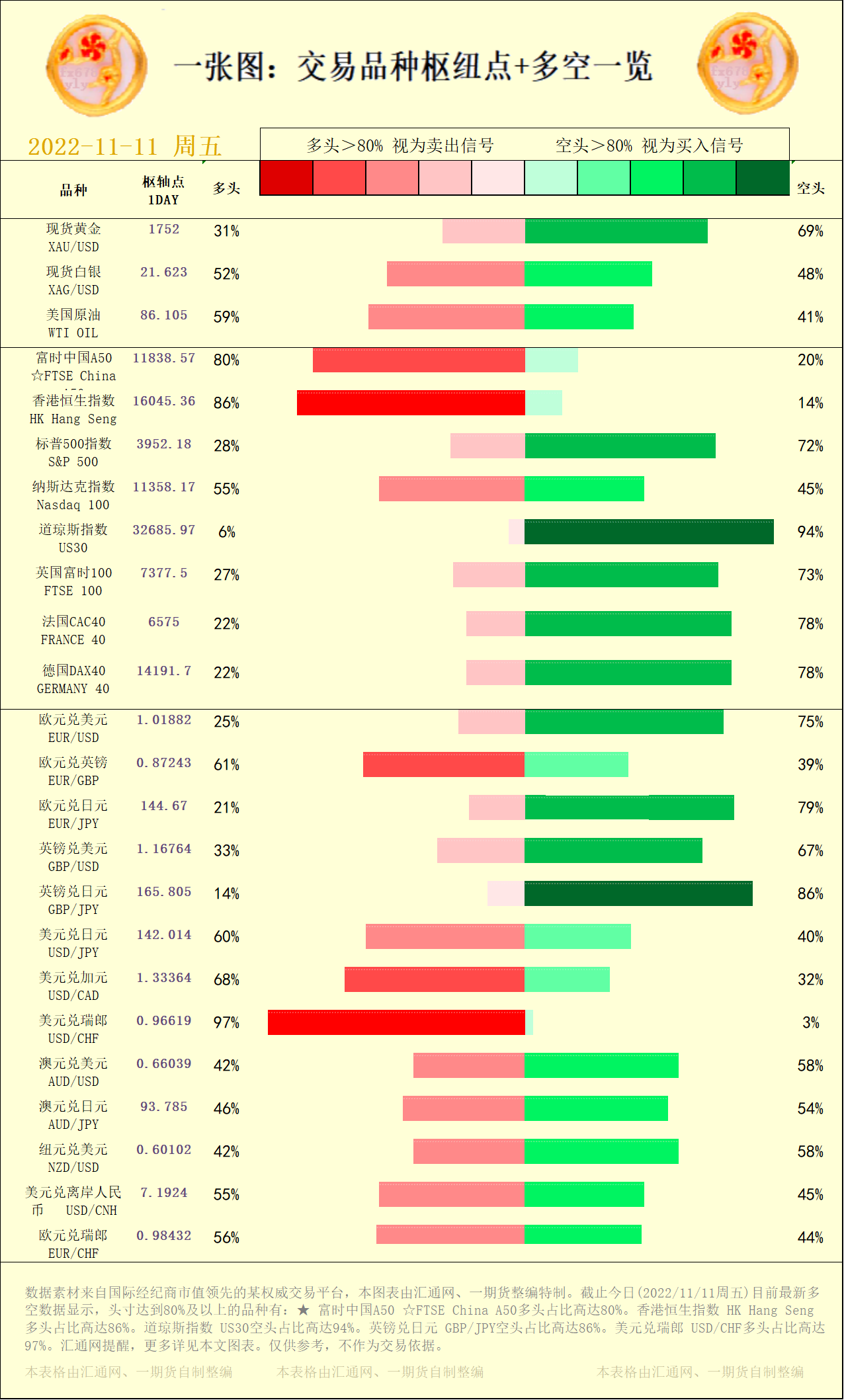 一张图:交易品种枢纽点+多空占比一览。截止今日(2022/11/11周五)目前最新多空数据显示,头寸达到80%及以上的品种有:★ 富时中国A50 ☆FTSE China A50多头占比高达80%。香港恒生指数 HK Hang Seng多头占比高达86%。道琼斯指数 US30空头占比高达94%。英镑兑日元 GBP/JPY空头占比高达86%。美元兑瑞郎 USD/CHF多头占比高达97%。汇通网提醒,更多详见本文图表。仅供参考,不作为交易依据。