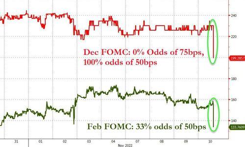 在周四CPI数据发布后,掉期市场对12月加息75个基点的预期,一度从原先的逾三成概率完全消失为零,这预示着市场几乎百分百确信,美联储下月将只会加息50个基点,至4.25%-4.50%。