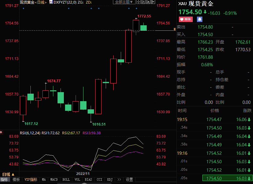 周一(11月14日),现货黄金价格回落,脱离上个交易日触及的三个月高位1772.55美元/盎司,因美联储高级官员警告称,市场对10月CPI反应过度,美联储并未软化抗通胀努力,推动美元和美债收益率反弹。