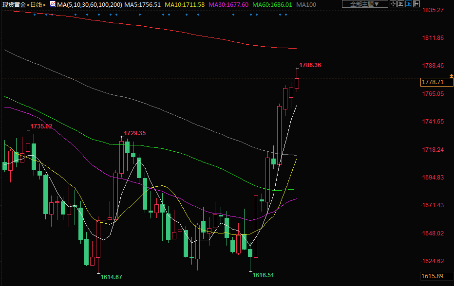 在其他贵金属中,现货白银下滑1.8%至每盎司21.56美元,铂金下跌0.4%至1013.25美元,钯金上涨2.9%至2085.52美元。