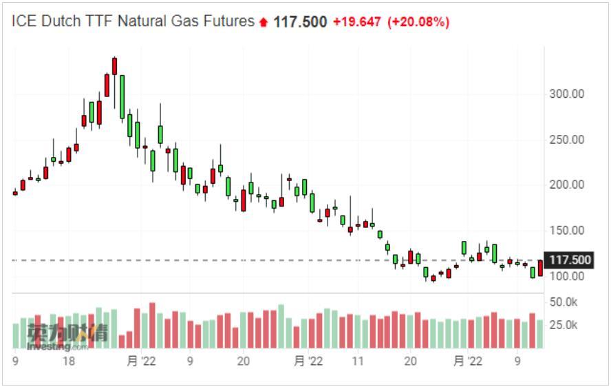 数据显示,欧洲基准荷兰TTF天然气期货价格暴涨20%。天气预报机构Maxar预计,在经历了长时间异常温暖的天气后,临近本周末,欧洲的某些地区将会变冷,柏林的气温预计将降至零度以下。这应该会迫使人们开始使用取暖器,从而提振天然气的需求。