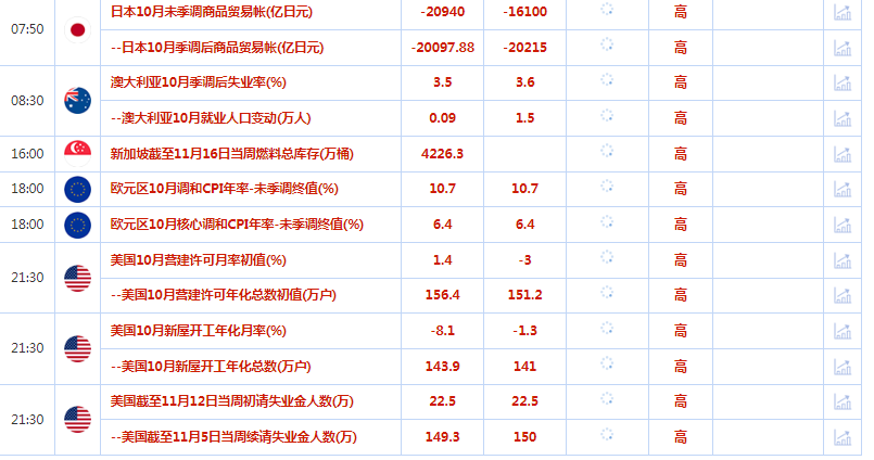 其他方面,周三公布的数据显示,英国通胀继续上升,在截至10月的12个月内创下41年新高,与美国通胀降温形成对比。英镑尾盘上涨0.31%,报1.1906美元。英国将于周四公布最新预算声明,预计将增税和削减开支。在财政大臣亨特的前任夸滕宣布了一揽子没有资金支持的减税计划后,英镑在9月份跌至1.0327美元的纪录低点。