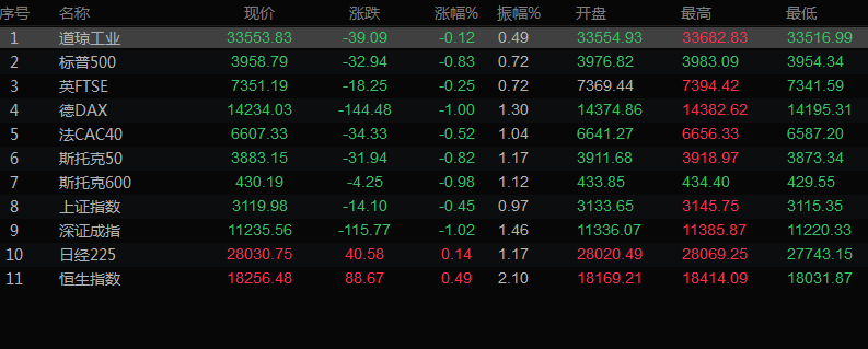 美股收盘情况:道琼斯工业指数下跌0.12%,至33553.83点;标普500指数下跌0.83%,至3958.79点;纳斯达克指数下跌1.54%,至11183.66。