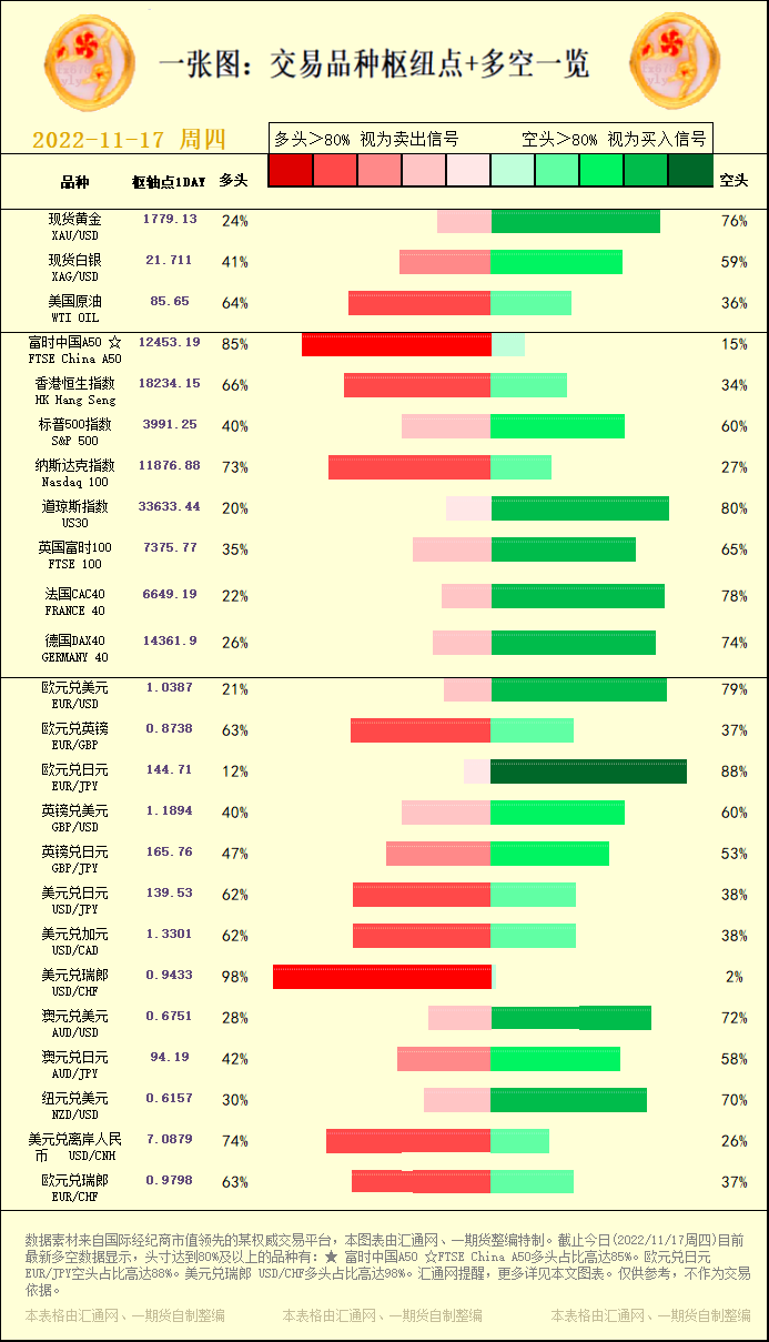 一张图:交易品种枢纽点+多空占比一览。截止今日(2022/11/17周四)目前最新多空数据显示,头寸达到80%及以上的品种有:★ 富时中国A50 ☆FTSE China A50多头占比高达85%。欧元兑日元 EUR/JPY空头占比高达88%。美元兑瑞郎 USD/CHF多头占比高达98%。汇通网提醒,更多详见本文图表。仅供参考,不作为交易依据。