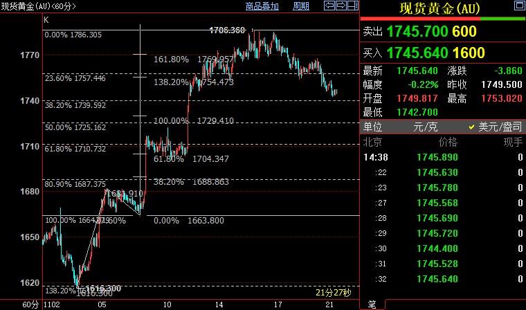 北京时间14:42,现货黄金下跌0.25%至1745.22美元/盎司;COMEX期金主力合约下跌0.43%至1746.7美元/盎司;美元指数上涨0.45%至107.48。