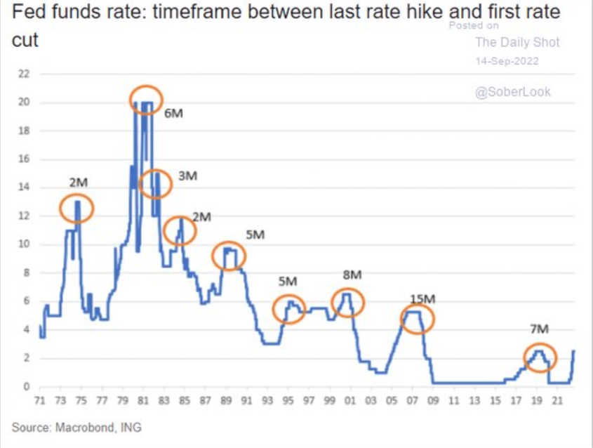 除了衰退本身的威胁外,能够支撑美联储在明年下半年降息的例子还有很多。例如我们此前曾提到过,纵观历史,当美联储达到其终端利率(目前定价为明年年中达到4.90%左右)时,下一个宽松周期的第一次降息通常会在几个月后就发生。