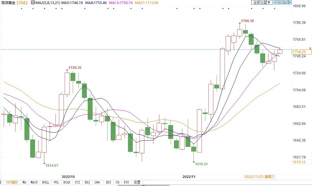 北京时间11月24日13:21,现货黄金报1754.32美元/盎司