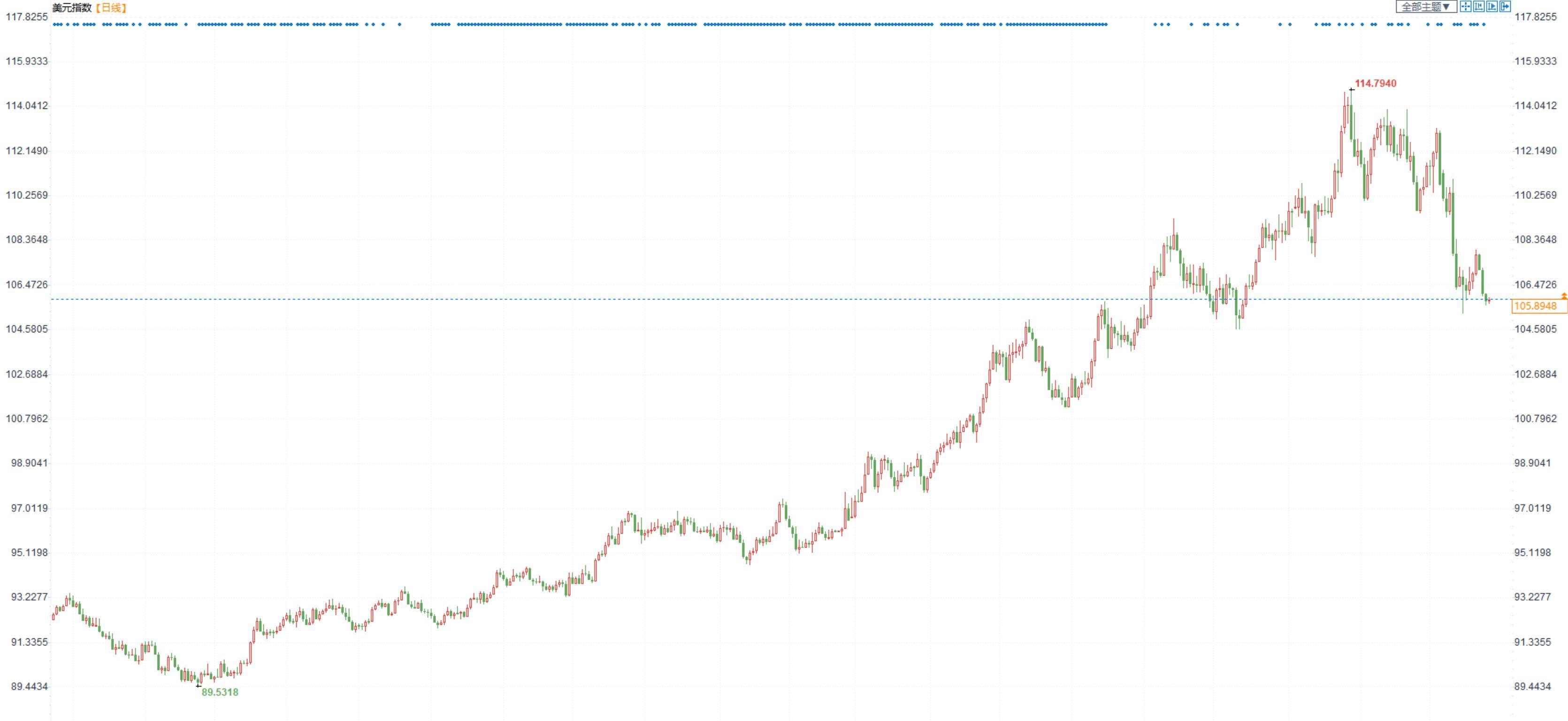 周五(11月25日)当周美元指数继续回落调整,美联储放缓升息步伐的预期给美元下行的压力。不过,地缘局势、全球经济放缓等因素,增加了美元的避险需求,限制美元下行。