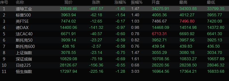 美股收盘情况:标普500指数下跌1.54%,收于3963.95点;纳斯达克指数下跌1.58%,至11049.50点;道琼斯工业指数下跌1.45%,至33849.46点。